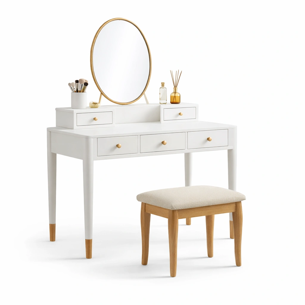 Schminktisch mit rundem Spiegel und mehreren Schubladen fuer strukturierte Aufbewahrung von Kosmetikartikeln. Klare Linien und kompakte Form eignen sich fuer verschiedene Raumgroessen. Stabile Konstruktion sorgt fuer sicheren Stand im Alltag.